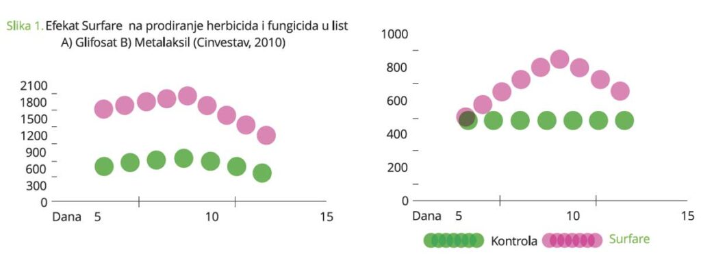 - Poboljšava brzinu prodiranja nanesene agrohemikalije ili sredstava prihrane, povećavajući njihovu efikasnost
